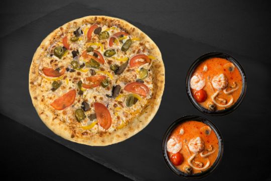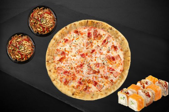 Пицца Карбонара, WOK c курицей 2шт, Филадельфия Микс
